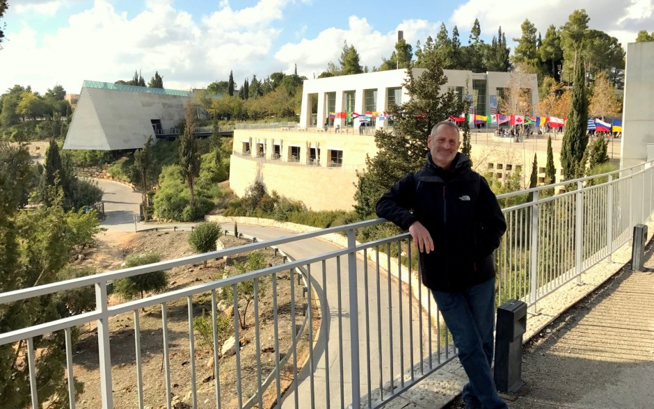 Le mémorial est impressionnant. Vous y trouverez entre autres des allées avec des arbres plantés pour « les justes », ceux qui ont aidé les juifs… un endroit où en permanence les nom de tous les enfants exterminés sont cités… beaucoup d’édifices offerts pas des familles… mais surtout un bâtiment, celui que vous voyez sur la photo avec moi, la structure triangulaire à ma droite. 🙂