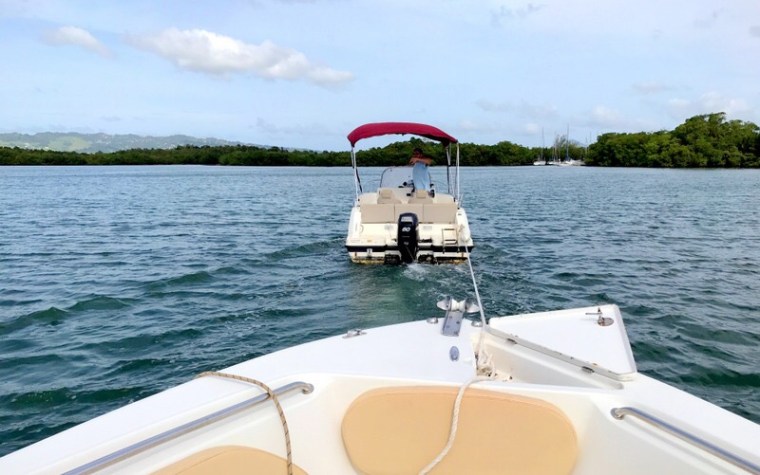 Hier nous sommes allé chercher les quatre bateaux que Sébastien a du mettre à l’abri de Maria. Ils se trouvaient dans un port naturelle magnifiquement situé près de l’aéroport au Lamantin. Avec des amis qui étaient venus pour l’aider, le voyage de retour commençait bien quand tout à coup en donnant un coup d’accélérateur au moteur 300 chevaux de notre bateau, il s’arrêtait net. 🚤