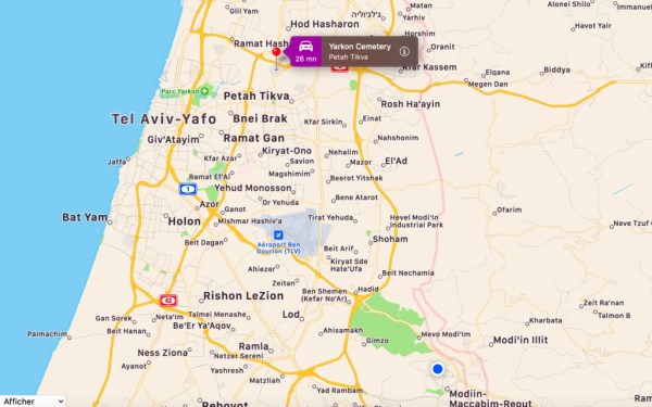 C’est l’emplacement de la tombe de mon père : Cimétière Yarkon de Petah Tikva, zone B1, rang 25, emplacement 23. Il est enterré à une dizaine de kilomètres de sa maison à Giv’ataim (sur la carte marqué sous le nom de Tel Aviv). Je vais y aller ce dimanche et partirai de Modi’in (point bleu) vers 8 heures pour ce voyage avec 4 bus, d’environ 2 heures.